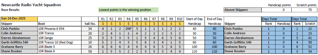 | Skipper | Boat | Sail No. | Current Handicap | | | Skipper | Yearly Total score | Rank | Yearly Total score | Rank |
